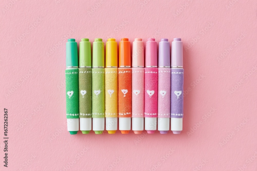 Top-Down Flat Lay of Heart-Decorated Gel Pens on Pink Paper, Organized by Color, Gentle Lighting, Colorful Stationary Aesthetic #1672262367
