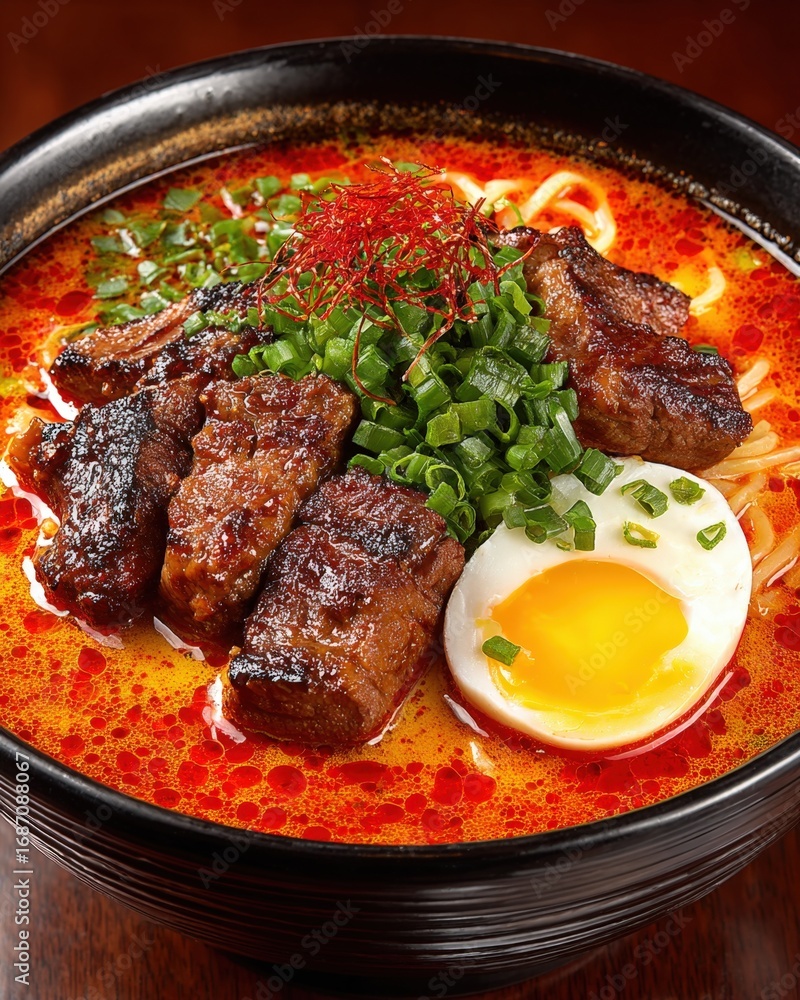 Top-Down View of a Spicy, High-Contrast Noodle Bowl with Seared Pork, Egg, and Scallions on Dark Wood #1687088067