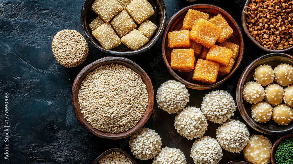 Traditional Indian sweets arranged with sesame seeds and jaggery for Makar Sankranti offering #1777990963