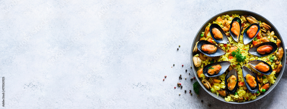 Traditional spanish seafood paella in pan rice, peas, shrimps, mussels, squid on light grey concrete background. Top view, copyspace #179263925