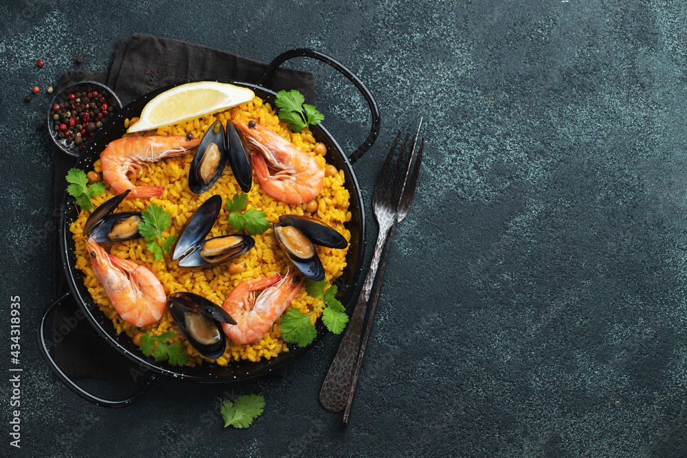 Traditional spanish seafood paella in pan with chickpeas, shrimps, mussels, squid on black concrete background. Top view with copy space #434318935