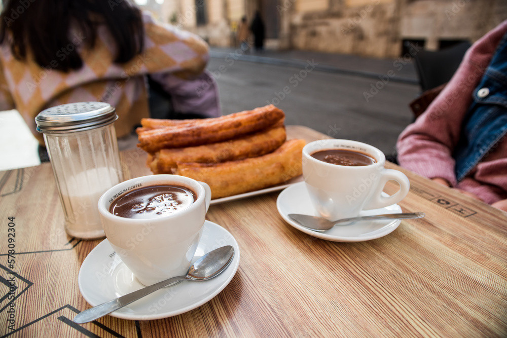 Tray of churros and two cups of chocolate on the terrace table, ready to eat the traditional Spanish churros in the bar. #578092304