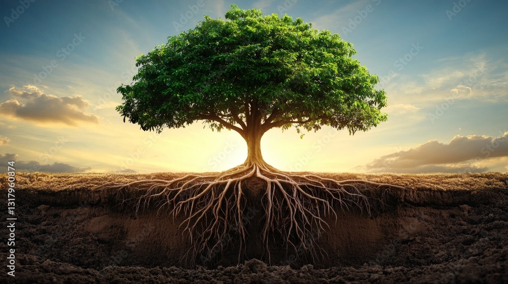 tree with branches extending upward while roots grow deeper, symbolizing balance, conceptual photography, copy space #1317960874