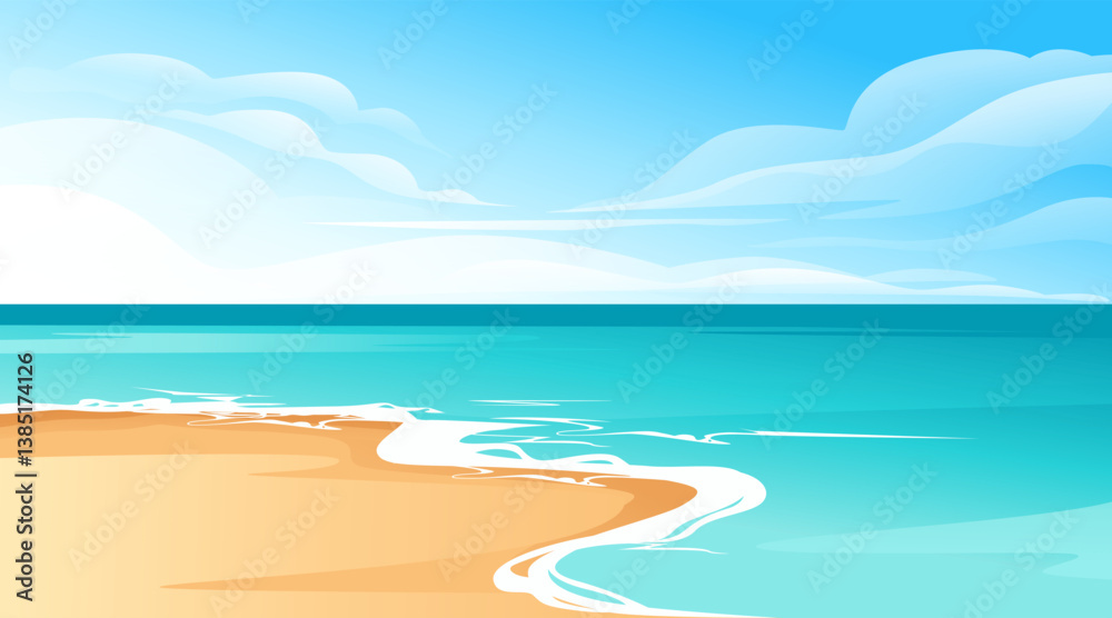 Tropical beach landscape. Turquoise ocean water. Sandy shoreline. Blue sky with white clouds. Coastal scenery. Vacation destination. Left section of panoramic seascape. Vector illustration #1385174126