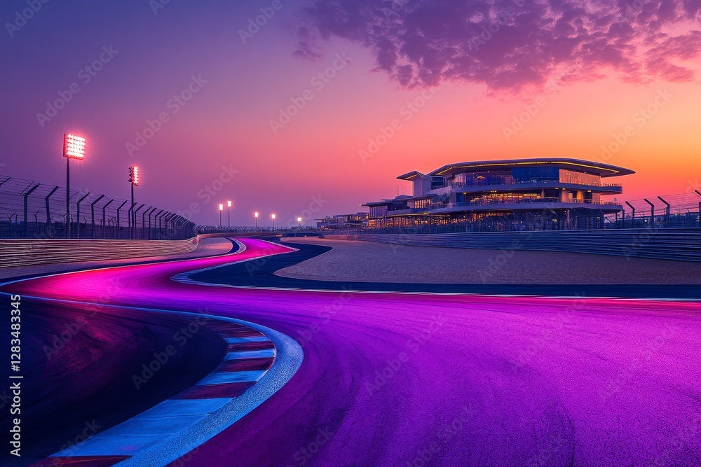 Twilight racing circuit illuminated by vibrant lights at a motorsport venue in an exciting atmosphere #1283483345