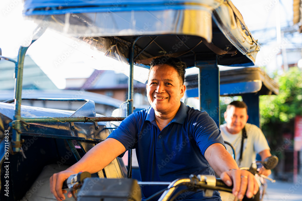 Two Filipino tricycle drivers share a joyful moment during a bright morning commute, smiling warmly at the camera while waiting on the street in Metro Manila. #1577114853