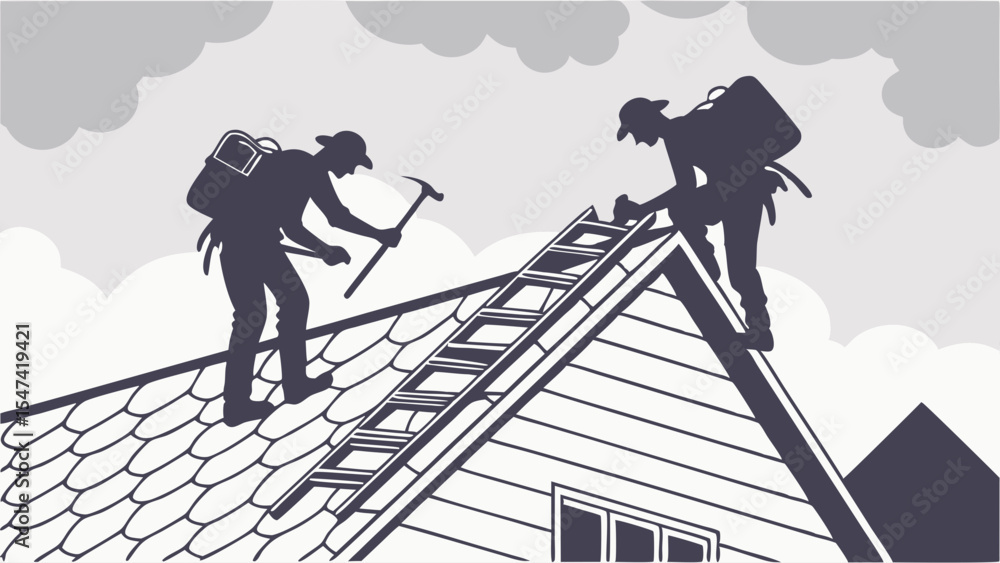 Two professional silhouetted roofers installing shingles on a residential roof with a ladder and hammer. Monochrome illustration of home construction and repair services. #1547419421