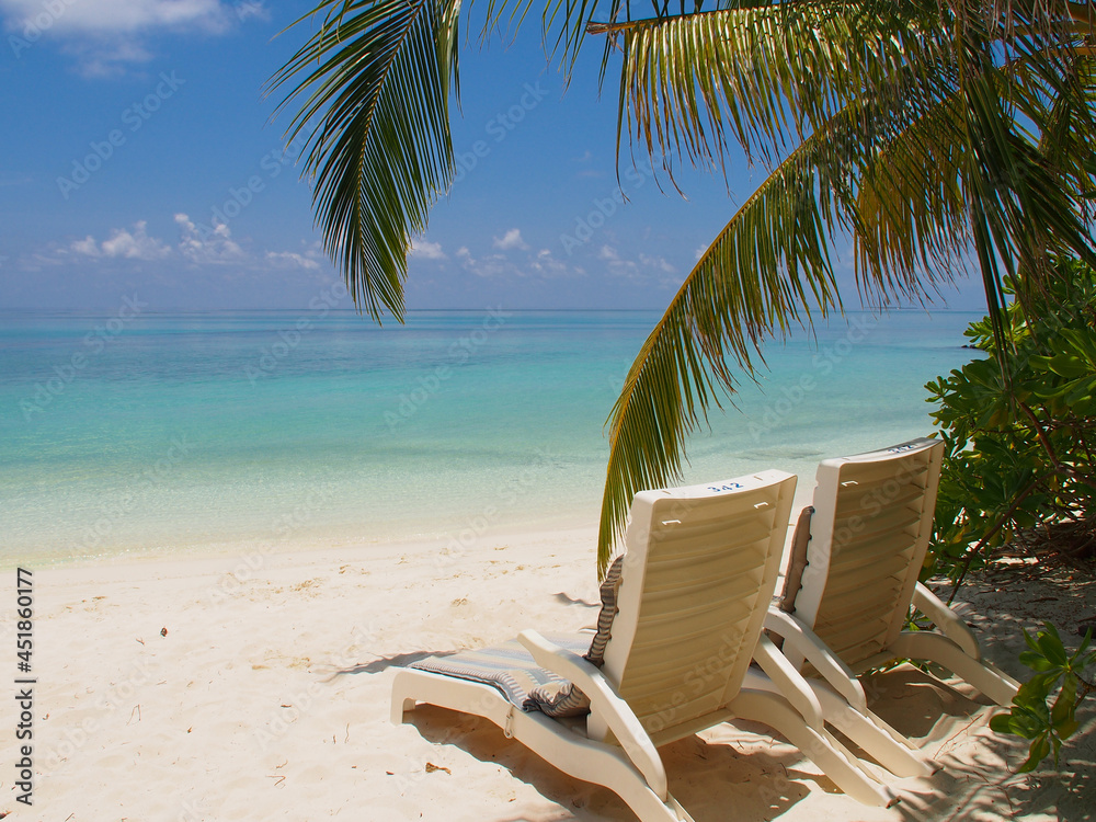 Two sun loungers on a snow-white coast with a blue ocean and green bushes in the Maldives. Copy space for text. #451860177