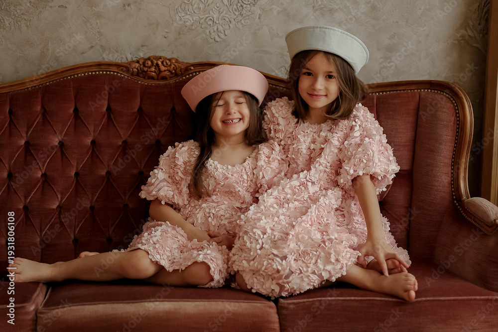 Two young girls in pink dresses sit together on a vintage red sofa smiling warmly in a cozy room #1931806108
