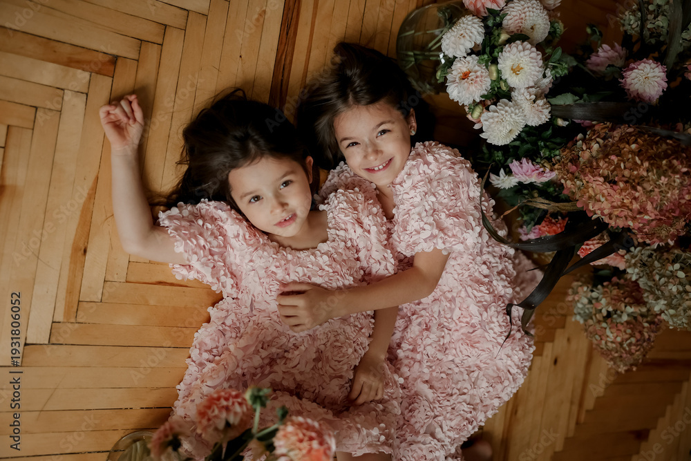 Two young girls smile and rest together on wooden floor near colorful flowers in soft natural light #1931806052