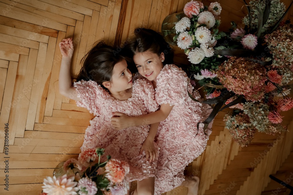Two young girls smile together on wooden floor surrounded by soft pink flowers and natural light #1931806036