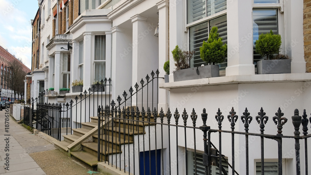 Typical Victorian terraced houses in England. Exterior view of cozy residential buildings in London with metal fence, several floors, windows and front door with molding. Real estate, Living apartment #1878616937