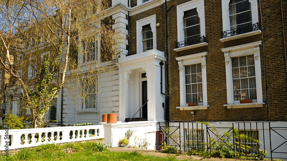 Typical Victorian terraced houses in England. Exterior view of cozy residential buildings in London with metal fence, several floors, windows and front door with molding. Real estate, Living apartment #1878618255