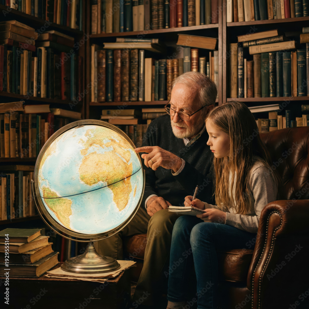 Un anciano y una niña estudian geografía en una biblioteca acogedora llena de libros. Él señala un globo terráqueo brillante mientras ella toma notas, resaltando un momento de mentoría. #1929555164
