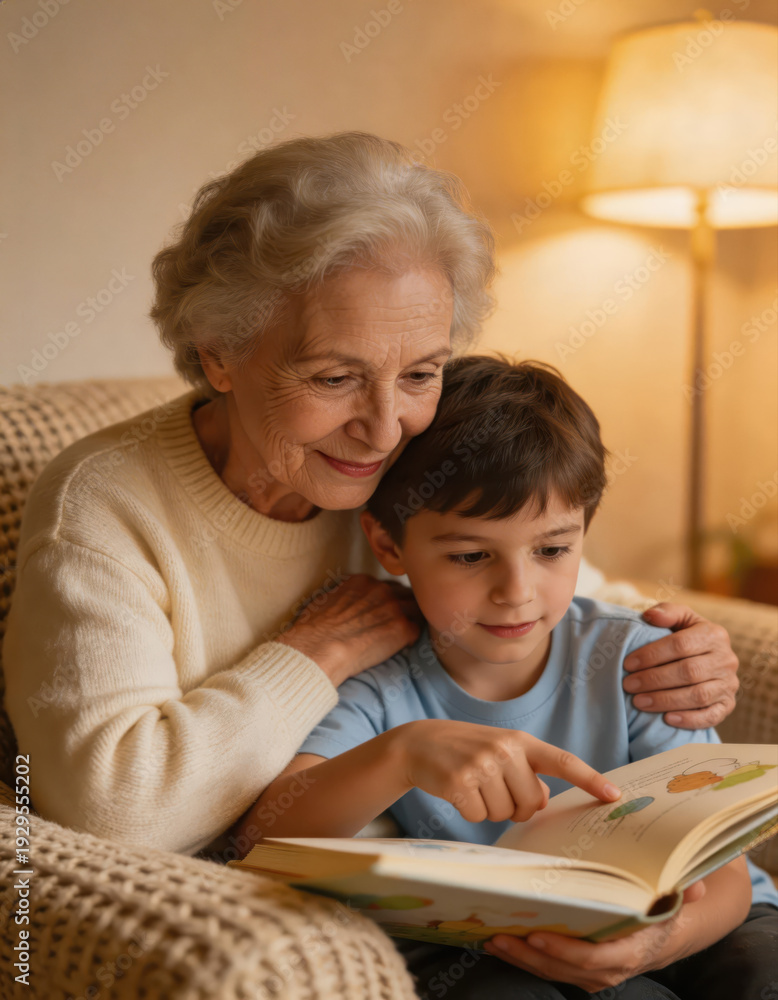 Una abuela cariñosa y su nieto se sientan juntos en un sofá acogedor leyendo un libro ilustrado. La luz cálida crea una atmósfera tierna de aprendizaje y conexión en casa. #1929555202
