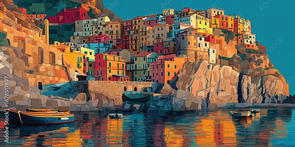 Una vista estilizada de los pueblos de Cinque Terre, Italia, con sus casas de colores vibrantes reflejándose en el agua. #1678517897