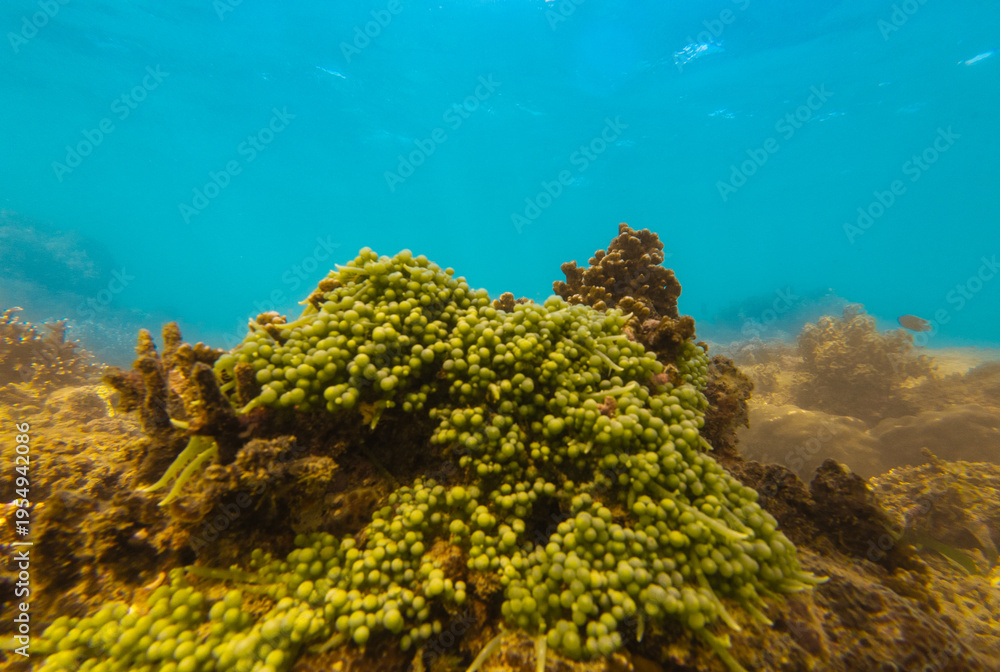 Underwater view of sea grapes with ocean waves on a coral reef. Green algae in clear tropical water creating a calm natural marine scene. #1954942086