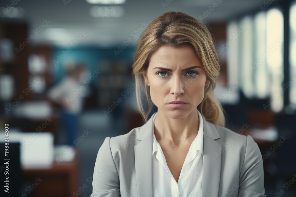 Upset businesswoman frowning with a serious expression, facing conflict or stress in office environment #1938204300
