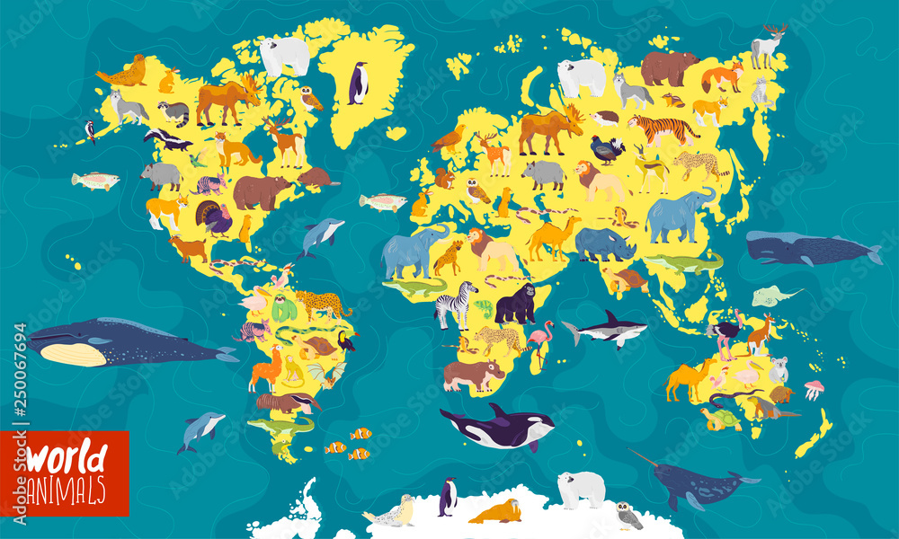 Vector flat illustration of world map with sea, oceans, continents and local animals & plants: polar bear, fox, squirrel, wolf, elephant, tiger, fish etc. Good for infographics, children book, banners #250067694