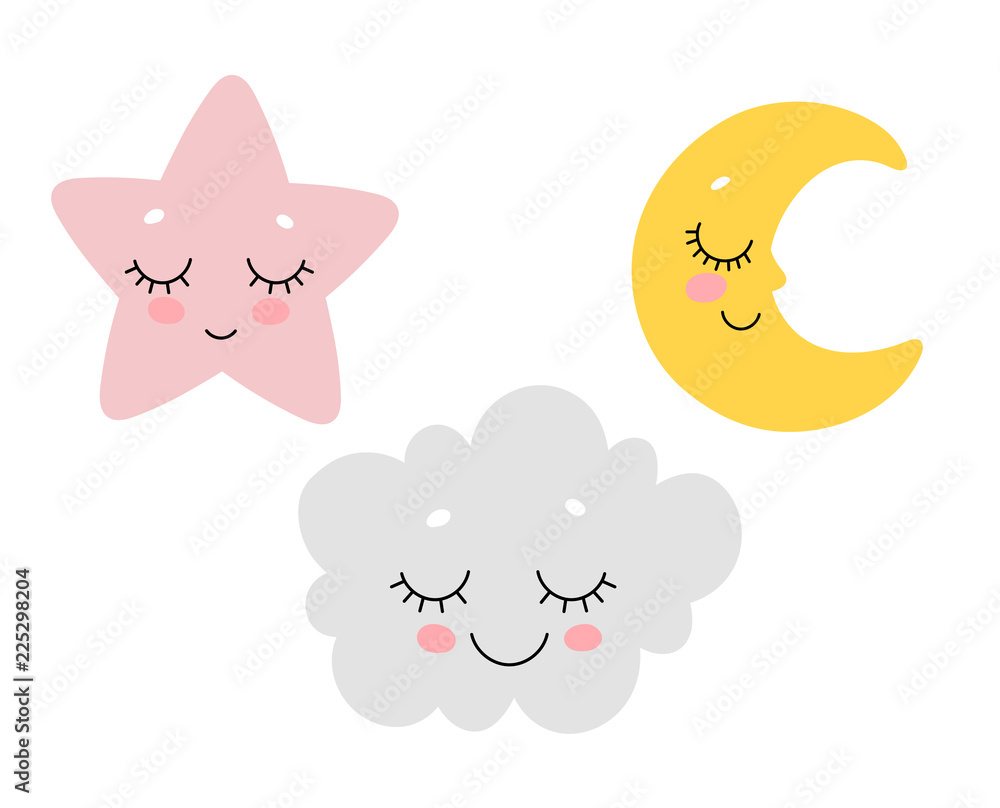 Vector illustration of cute sleeping cloud, moon and star. Scandinavian nursery print design. #225298204