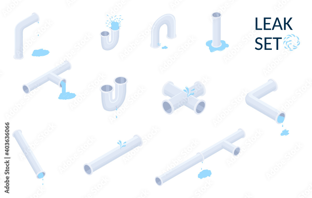 Vector isometric set of plumbing pipes with leaks isolated on white.Isometric illustration. #403636066