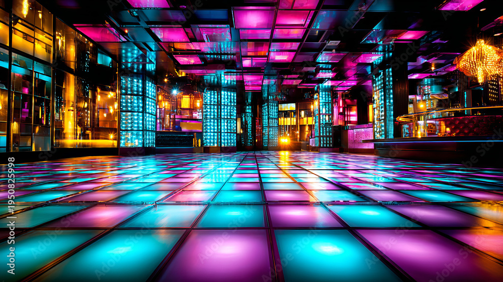 Vibrant Nightclub Dance Floor with Neon Lights and Reflective Surfaces #1950825998