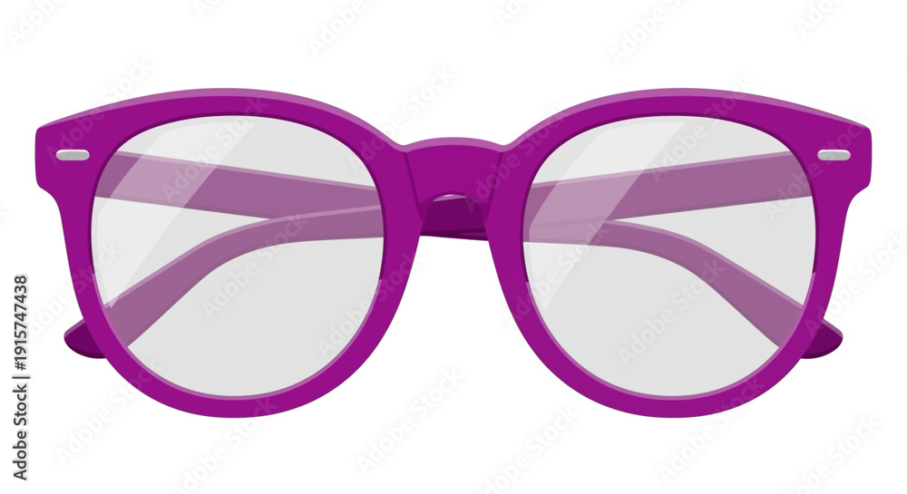 Vibrant purple glasses with clear lenses and rounded frames showcased against a plain background from a frontal viewpoint #1915747438