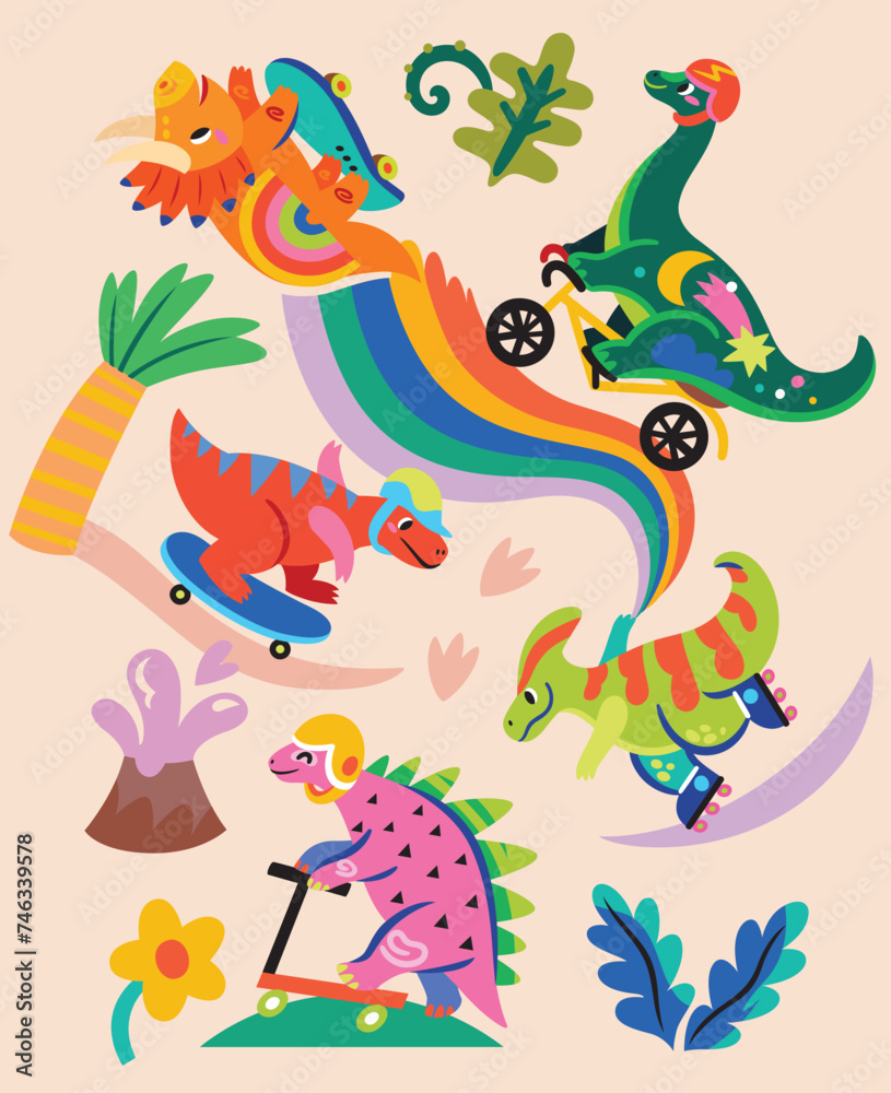 Vibrant skating dinosaurs in the park. Colourful cartoon dinosaurs ride on skates, rollers and bicycle in the park #746339578