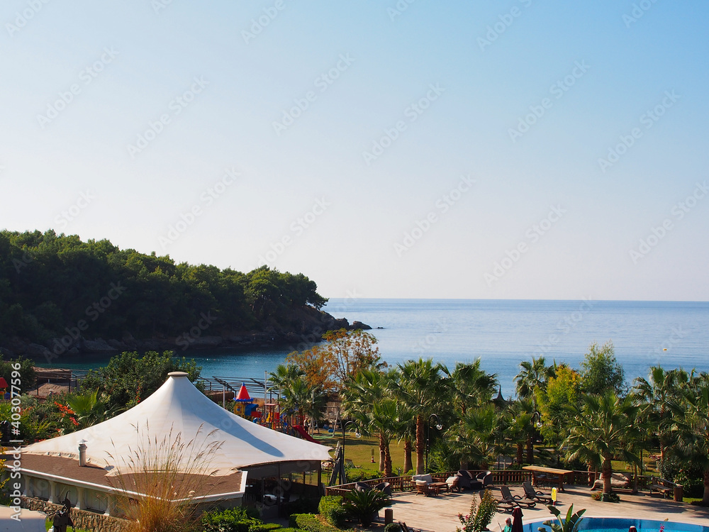 View from the top on the swimming pool, sea, trees and landscape. Turkey, Alanya. #403077596