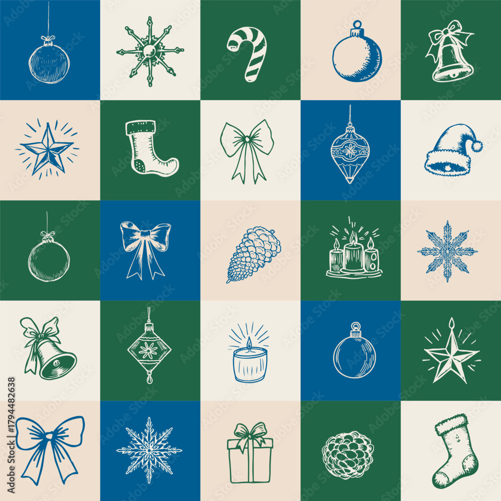 Vintage Christmas Seamless Pattern in Sketch Line Drawing Art Style. Cute Xmas Print Design for Winter Holiday, New Year, Greeting Cards, Party Invitations Design, Fabric, Textile, Gift Paper. Vector #1794482638
