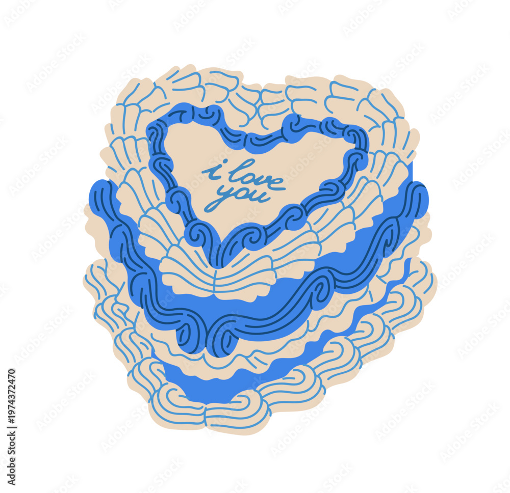 Vintage coquette cake, heart dessert. Ornate confectionery, blue creamy pastry with Love you text. Romantic bakery with cream piping decoration. Flat vector illustration isolated on white background #1974372470