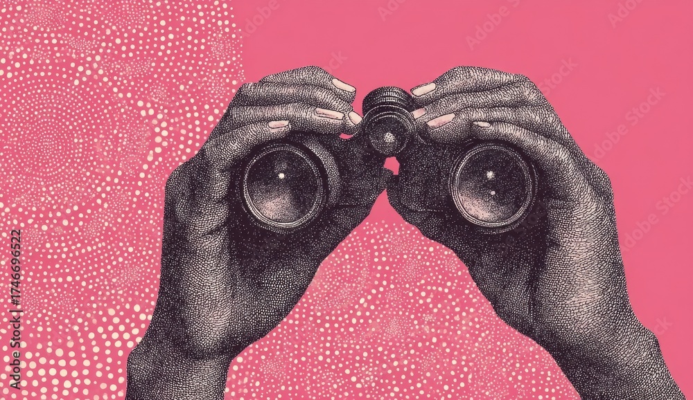 Vintage of two hands holding binoculars against a pink dotted abstract #1746696522