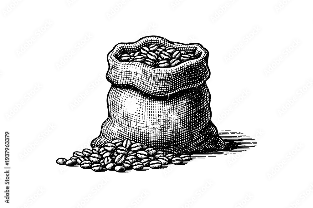 Vintage sack of coffee beans with intricate hand-drawn detailing #1937963379