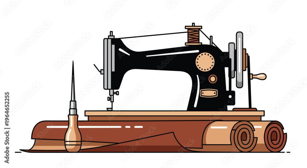 Vintage sewing machine with wooden base and spool of thread, Generative AI. #1964652255