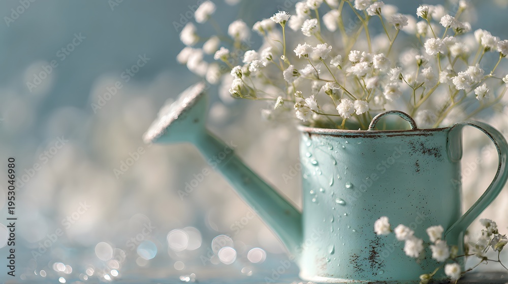 Vintage watering can highlighted with delicate gypsophila blooms and ample text space in a serene spring backdrop #1953046980