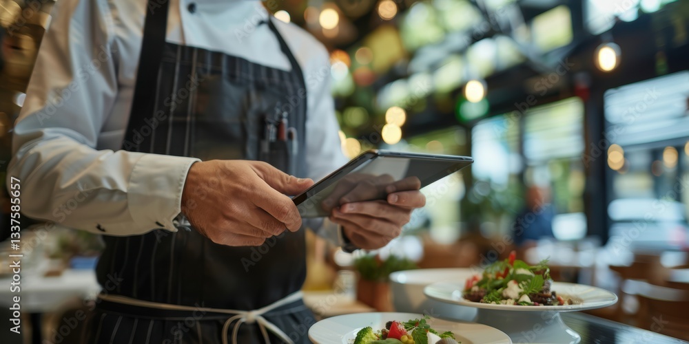 Waitstaff using a digital tablet for managing orders and payments, showcasing a blend of hospitality and technology in a dining environment #1337585657