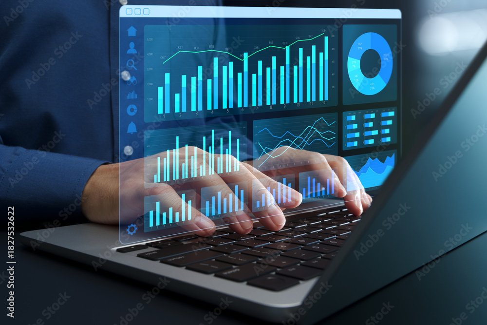 Web analytics dashboard. Marketing data visualization. Statistical graphs and reports. Businessperson analyzing website traffic using a laptop computer. #1827532622