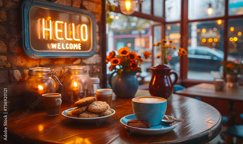 Welcoming cafe scene with HELLO AND WELCOME lightbox message, fresh espresso, cookies, and decorative vases on a wooden table #736920121