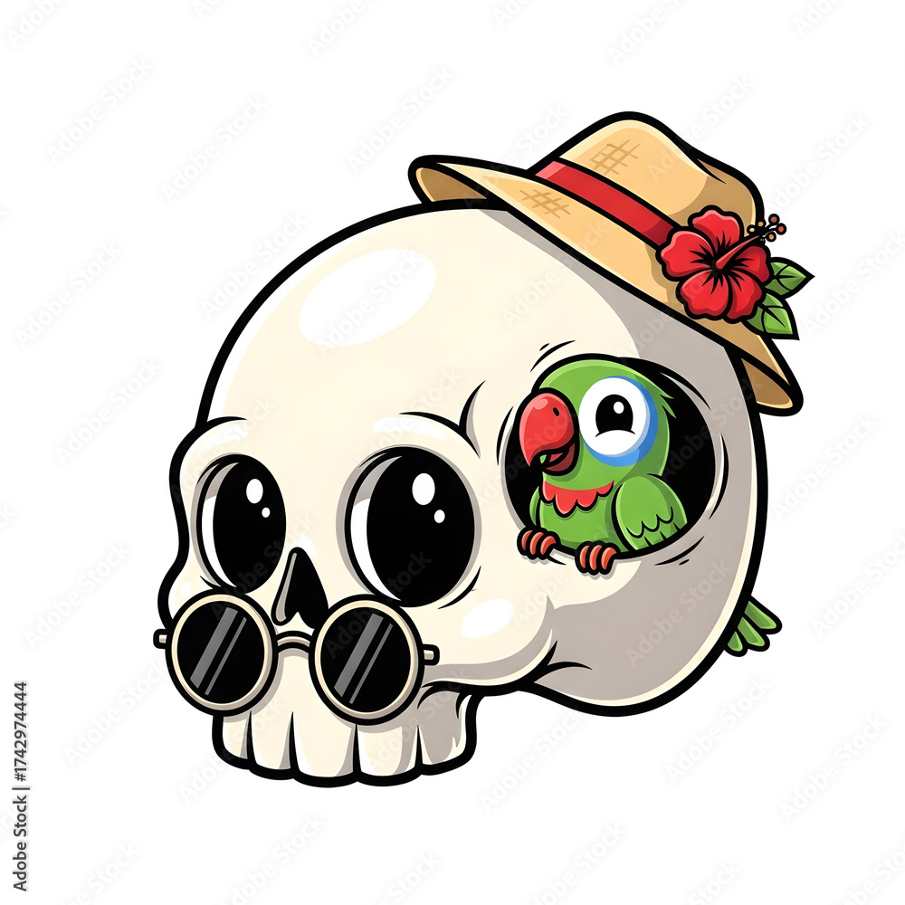 Whimsical Cartoon Skull Wearing Sunglasses and a Tropical Hat with a Small Parrot Peeking from Eye Socket #1742974444