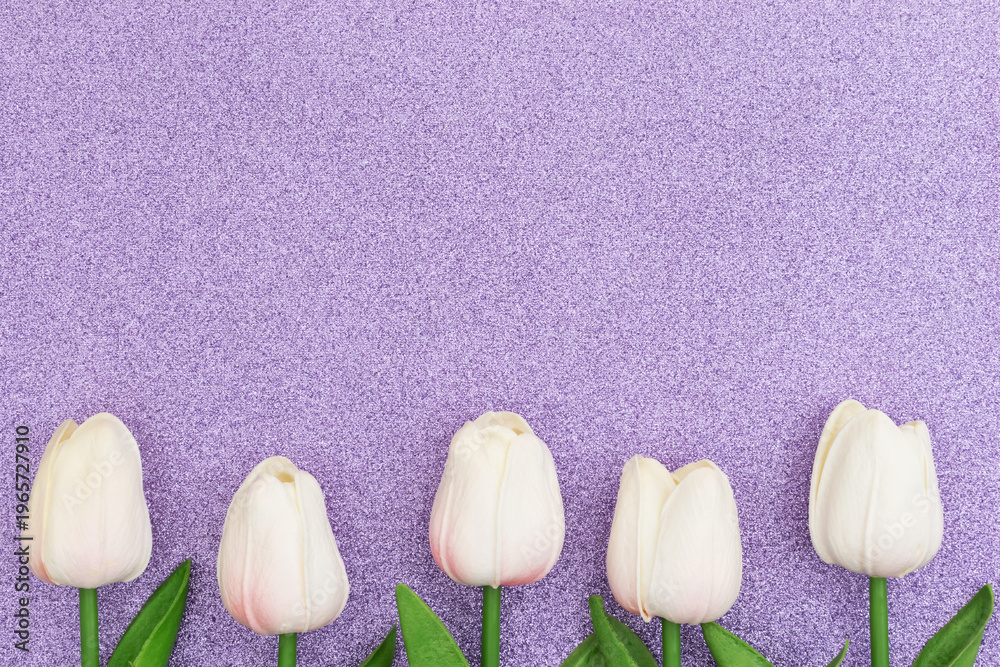 White tulips on purple glitter spring background #1965727910