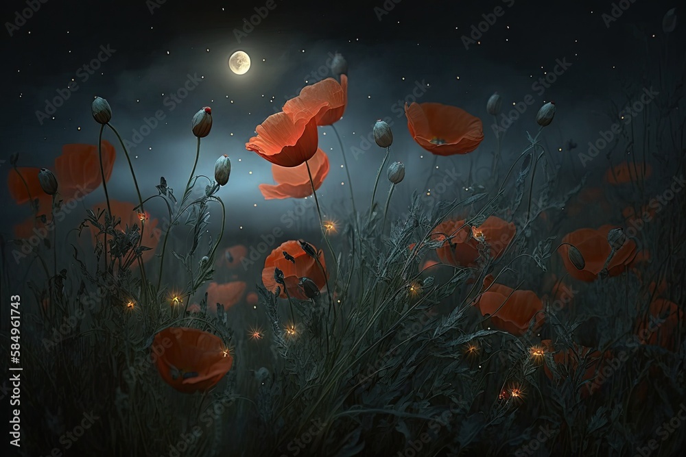 wild poppies on a moonlit night, flowers, night glow #584961743