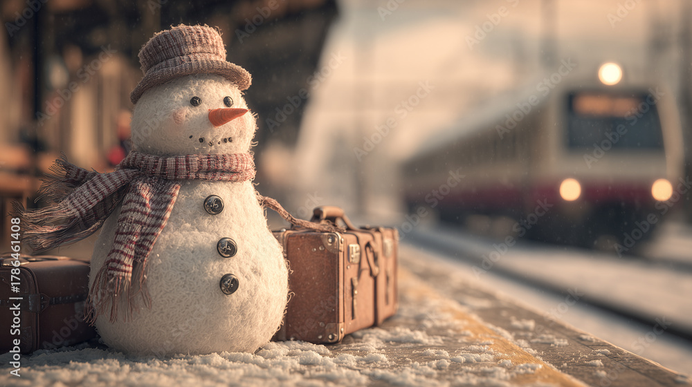Winter Christmas Train Travel. Cute Snowman with Suitcases at Train Station on Snowy Day Depicts Winter Travel and Holiday Spirit. Image Made Using Generative AI. #1786461408