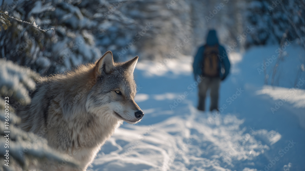 Wolf in Snowy Forest Observing Lone hiker on Winter Path in Serene Wilderness Setting. Image made using Generative AI. #1765200723