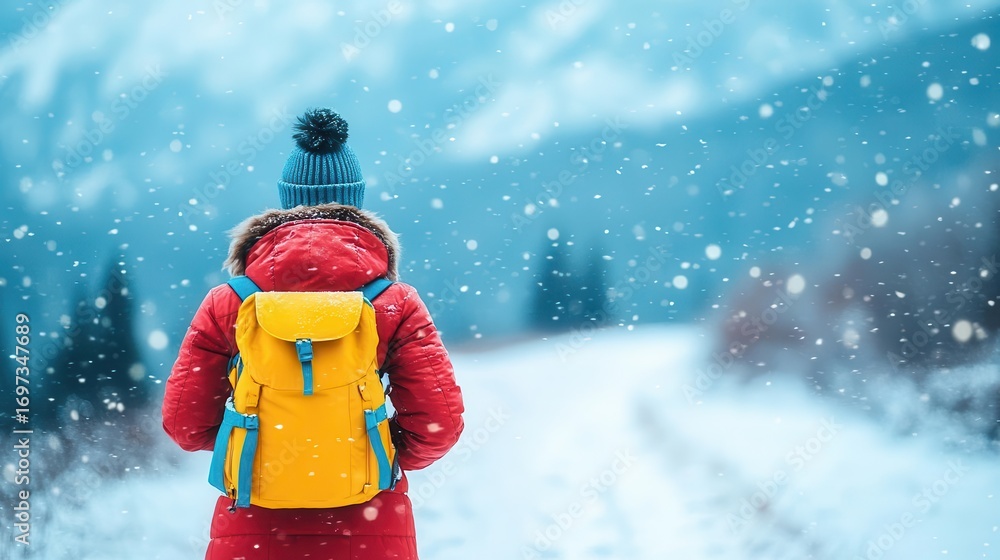 Woman walking through snowy winter landscape with backpack and warm clothing du snowfall in a scenic outdoor winter adventure setting #1697347689