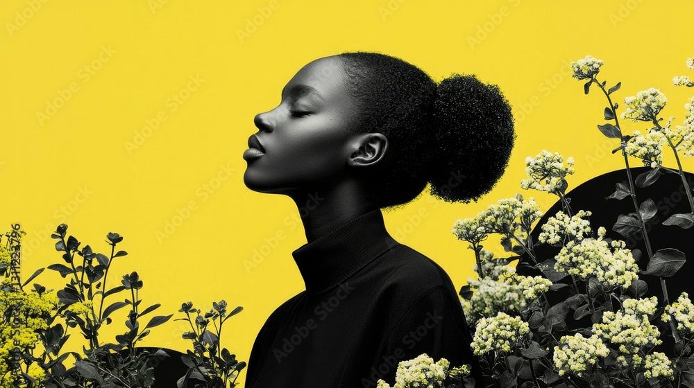 Woman, Yellow Background, Floral Art #1311223796