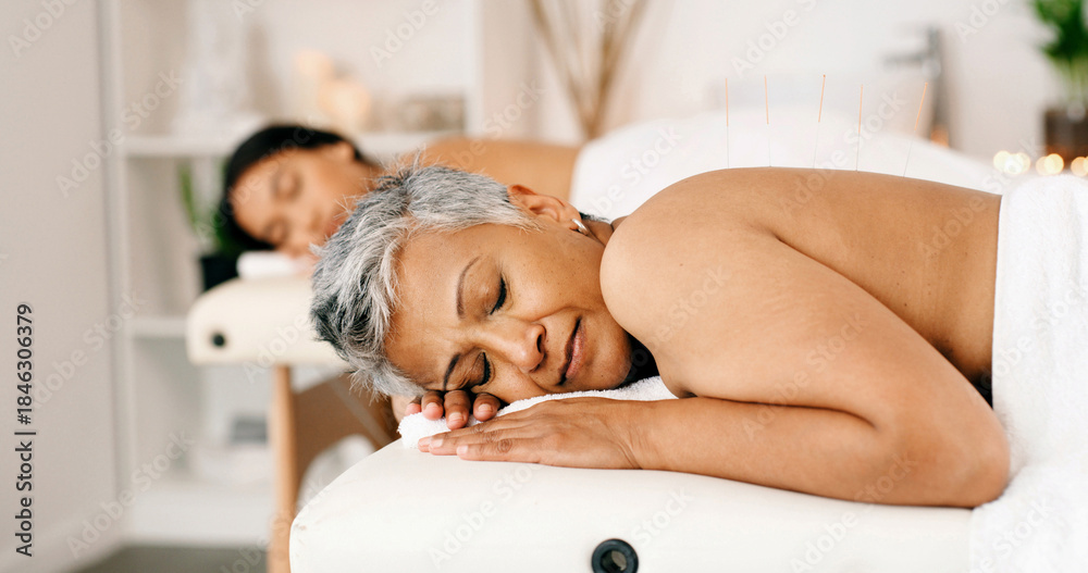 Women, sleeping or acupuncture therapy with massage bed for spa, body treatment or healing in salon. Mature, female people or relax on holiday getaway together with comfort for zen or beauty session #1846306379