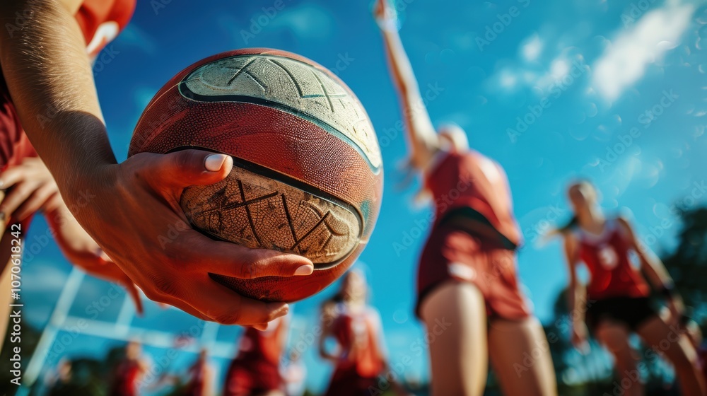 Womens netball team engages in defense, offense, and passing during community competitions and practice sessions, focusing on teamwork and athletic training on the court #1070618242