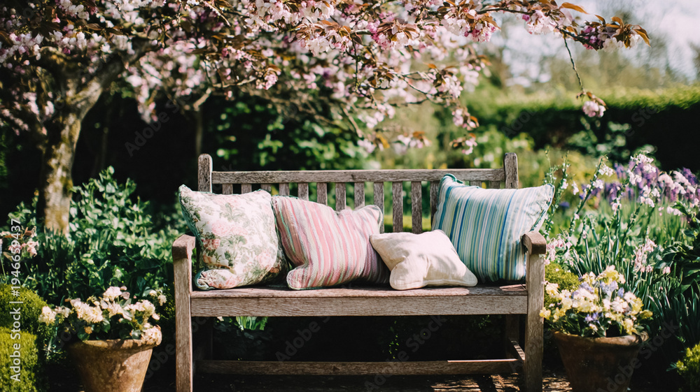 Wooden garden bench with patterned cushions under a blooming cherry tree, showcasing a beautiful spring outdoor scene #1946659437
