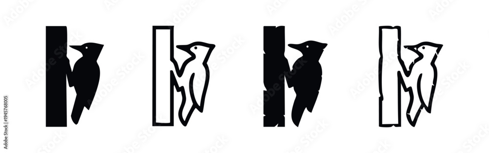 Woodpecker Vector Icons. Bird Silhouette and Outline Illustrations Perched on a Tree Trunk. #1945768005