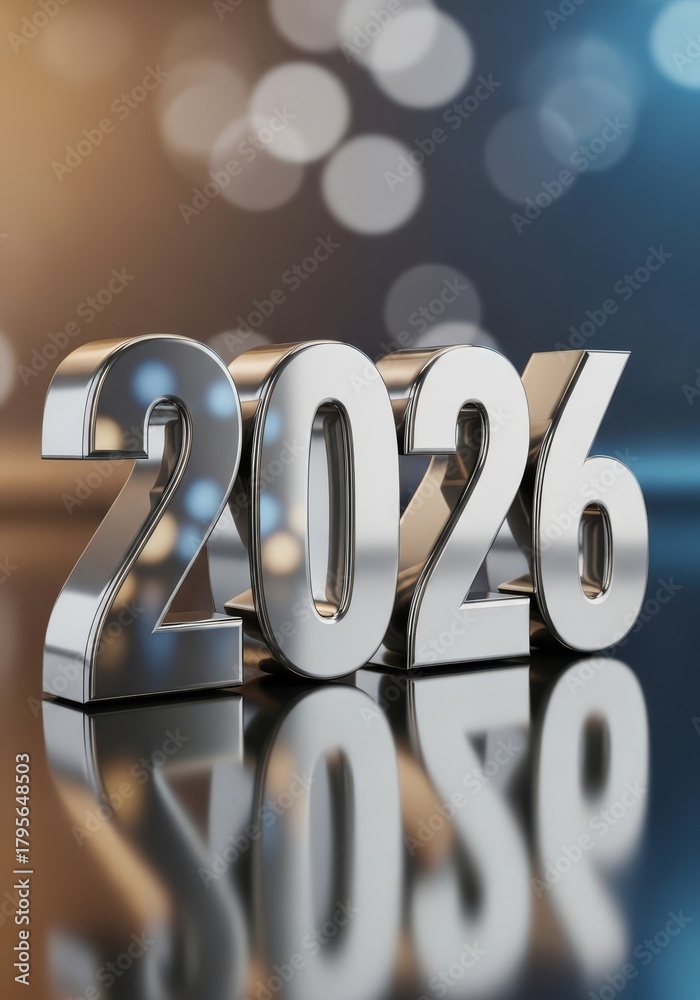 Year Two Thousand Twenty Six - Silver numbers spelling 2026 with bokeh lights in the background on a reflective surface #1795648503